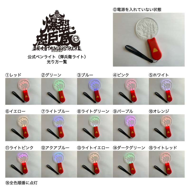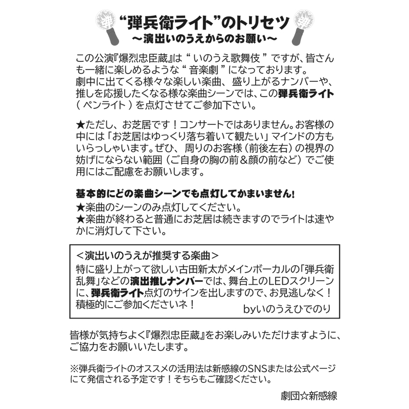 皆様が気持ちよく『爆烈忠臣蔵』をお楽しみいただけますように、ご協力をお願いいたします。 詳細は下記をご確認ください。■爆烈忠臣蔵/ペンライト(弾兵衛ライト)の使用について/新感線ブログ