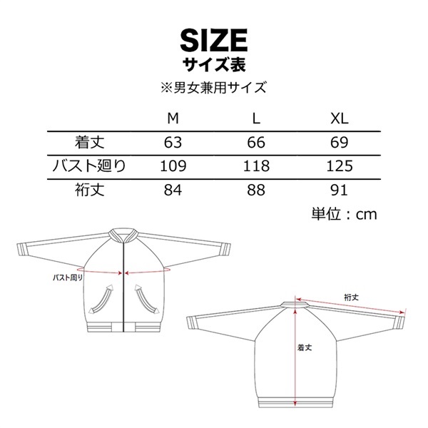 ・Mサイズ:着丈(背中心~) 63cm / バストまわり 109cm / 裄丈 84cm・Lサイズ:着丈(背中心~) 66cm / バストまわり 118cm / 裄丈 88cm・XLサイズ:着丈(背中心~) 69cm / バストまわり 125cm / 裄丈 91cm