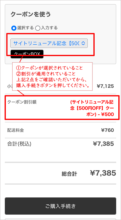 ご利用いただけるクーポンがある場合、マイページの[クーポンBOX]に表示されます。 実際にクーポンをご使用されるには、商品をカートに投入後に表示される「カート内容確認」ページに表示される【クーポンを使う】欄にてご利用されたいクーポンをご選択ください。 利用できるクーポンがある場合には、マイページの【クーポンBOX】内で表示されます。 クーポンには、使用条件や使用期限が明記されています。条件等によってはご利用いただけない場合がありますので、予めご確認ください。 実際にクーポンをご利用いただくには、【カート】に商品を入れたあと、クーポンを使う欄にて、使用されたいクーポンをご選択いただきます。ご自身で選択しない限りご利用いただけません。ご注意ください。 利用できるクーポンがない場合には、ここには何も表示されません。 クーポンを選択しましたら、「クーポン割引額が適用されたこと」「合計金額が変更されたこと」を必ずご確認の上、購入手続きにお進みください。 ※クーポンのご利用は会員様限定となります。ご希望の方は、新規会員登録(無料)をお願いいたします。 ※クーポンの配布・ご利用はお一人様1回のみとさせていただきます。複数アカウントで登録された場合には、ご利用時に弊社より確認のご連絡させていただく場合がございます。